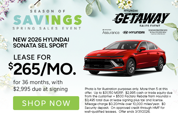 More than 5 at this offer. Up to $31,150 MSRP. $2,995 cash or trade equity due from the customer + $500 Factory Rebate from Hyundai = $3,495 total due at lease signing plus tax and license. Mileage charge $0.20/mile over 10,000 miles/year. $0 Security deposit. On approved credit through HMF for well-qualified lessees. Offer ends 3/31/2026.