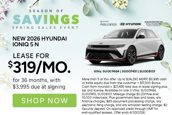 More than 5 at this offer. Up to $34,290 MSRP. $3,995 cash or trade equity due from the customer + $17,500 Bonus Cash from Hyundai = $21,495 total due at lease signing plus tax and license. Available on only 3 VINs: SU007484, SU007451, SU008101. Mileage charge $0.20/mile over 10,000 miles/year. Plus government fees and taxes, any finance charges, $85 document processing charge, any electronic filing charge, and any emission testing charge. $0 Security deposit. On approved credit through HMF for well-qualified lessees. Offer ends 4/30/2026.