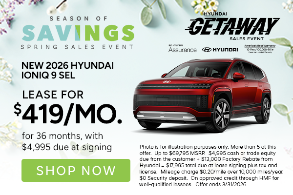 More than 5 at this offer. Up to $69,795 MSRP. $4,995 cash or trade equity due from the customer + $13,000 Factory Rebate from Hyundai = $17,995 total due at lease signing plus tax and license. Mileage charge $0.20/mile over 10,000 miles/year. $0 Security deposit. On approved credit through HMF for well-qualified lessees. Offer ends 3/31/2026.